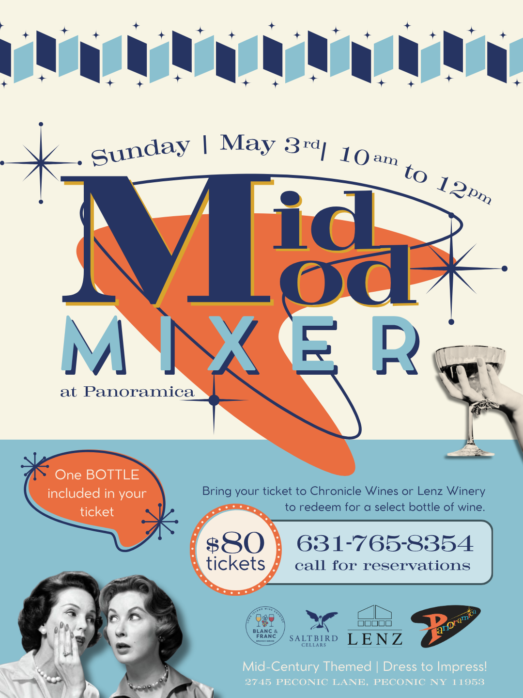 Join us alongside Lenz Winery for a Mid-Mod Themed Mixer at Panoramica on Sunday, May 3rd. Tickets include wine tasting and mid-modern themed food, plus a bottle of select wine. Call: 631-765-8354 for reservations.